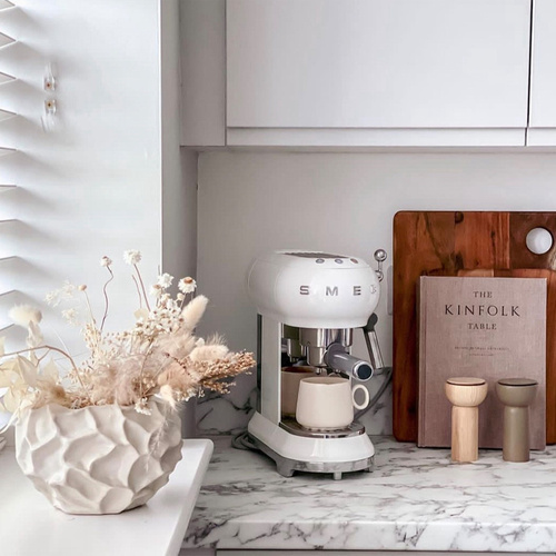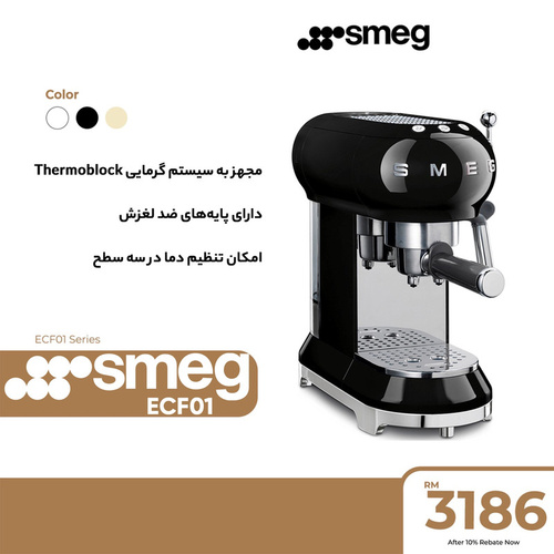 اسپرسوساز «اسمگ» (Smeg) مدل «ECF01» یک محصول با طراحی کلاسیک و زیباست. با استفاده از این محصول میتوانید اسپرسو و کاپوچینو را بهراحتی تهیه کنید. حجم مخزن آب این دستگاه 1 لیتر است و از دیگر مشخصات فنی آن میتوان به داشتن 2 عدد نازل، و سیستم گرمایی Thermoblock اشاره کرد. اسپرسوساز ECF01 همچنین دارای پایههای ضد لغزش است؛ این قابلیت بسیار کاربردی و وجود آن تاحد زیادی خیال کاربر را برای امنیت دستگاه راحت میکند. جنس بدنه این دستگاه از استیل و پلاستیک است و از کیفیت ساخت بالایی برخوردار است. گفتنی است، سازنده این دستگاه، شرکت اسمگ، یکی از تولیدکنندگان و عرضهکنندگان موفق لوازمخانگی است که سالها در حوزه معرفی و عرضه محصولات باکیفیت مشغول است. این شرکت ایتالیایی کار خود را از قرن 19 میلادی آغاز کرده و امروزه بهعنوان برندی محبوب مورد کاربران لوازمخانگی است. اسپرسوساز ECF01 یکی از محصولات خوشساخت این شرکت مطرح است که از ظاهر کلاسیک بسیار زیبایی برخوردار است.